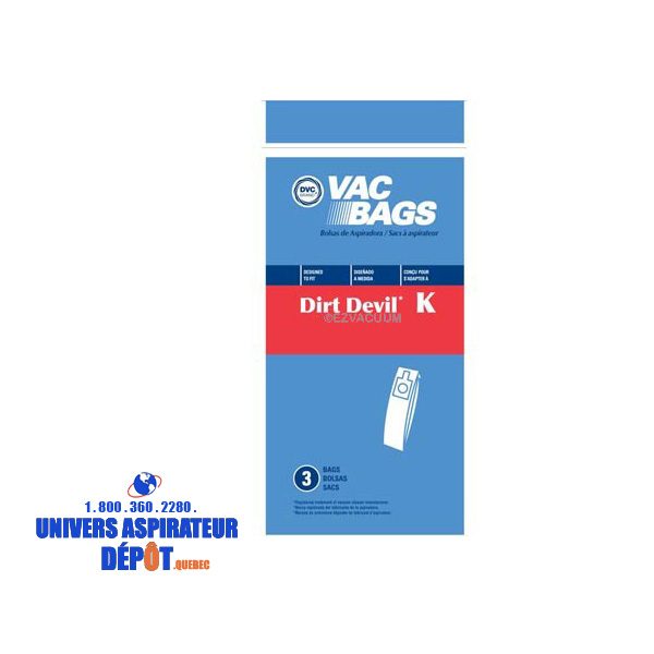 $6.99 quantité de Sac Dirt Devil K Ajouter au panier Catégories : Accessoires Sacs Tag: Dirt Devil Description Sacs aspirateur Type K Dirt Devil Royal Pour les modèles Stick Vac 3 sacs par paquet
